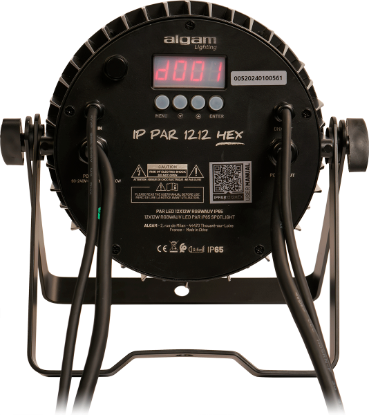Bénéficiant d'une protection IP65, le IP-PAR-1212HEX est équipé d'une connectique scellée sur la machine et de rallonges de connexion, aussi bien pour les câbles d'alimentation que pour le DMX, dont les extrémités sont protégées par un capuchon en caoutchouc afin d'éviter toute infiltration dans les connecteurs. Très complet, ce projecteur est capable de fonctionner en mode automatique, de réagir à la musique ambiante, d'être contrôlé via un contrôleur DMX ou un appareil maître, et peut également être paramétré via le clavier de commande présent au dos.