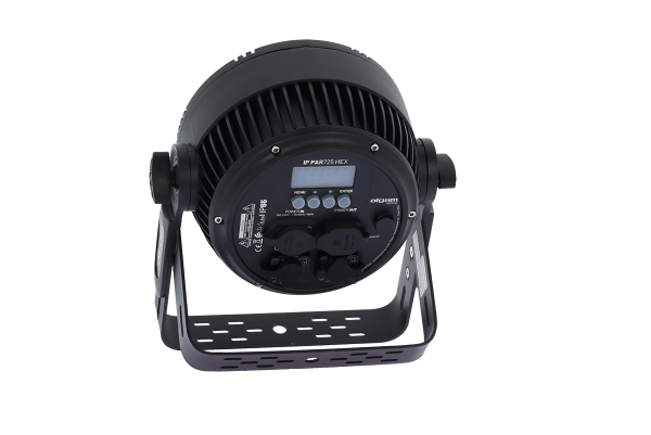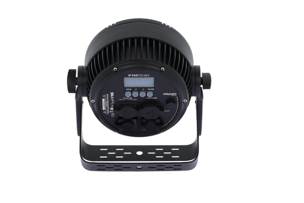 Bénéficiant d'une protection IP65, le IP PAR 725 HEX est équipé d'une connectique Seetronic scellée sur la machine, et est livré avec des câbles d'alimentation PowerCon et DMX IP afin d'éviter toute infiltration dans les connecteurs. Très complet, ce projecteur est capable de fonctionner en mode automatique, de réagir à la musique ambiante, d'être contrôlé via un contrôleur DMX ou un appareil maître, et peut également être paramétré via le clavier de commande présent au dos.