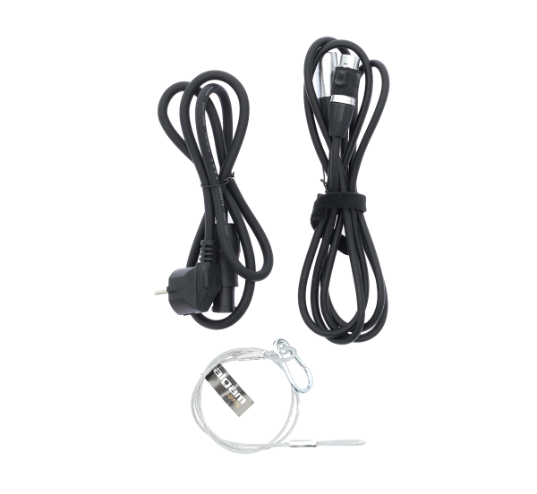 - Livré avec câble d’alimentation et DMX et leur velcro attache-câble, double lyre d’accroche et élingue de sécurité