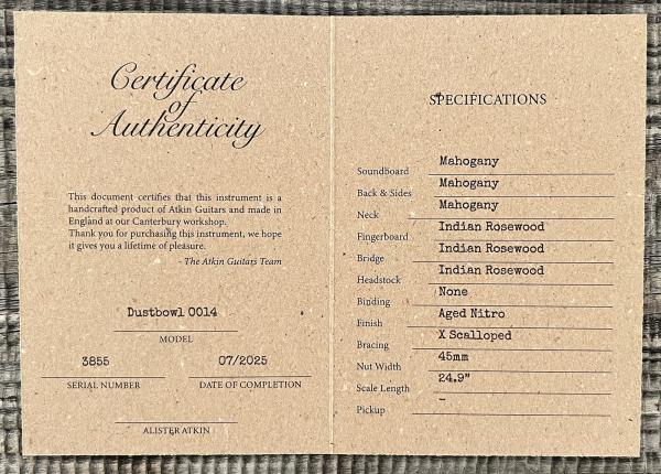 Elaborée à partir d'essences sélectionnées drastiquement, il est impossible de prendre l'Atkin Dust Bowl OO14 à revers (table Acajou, caisse Acajou, touche et chevalet Palissandre indien).