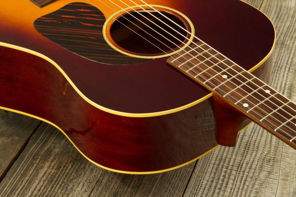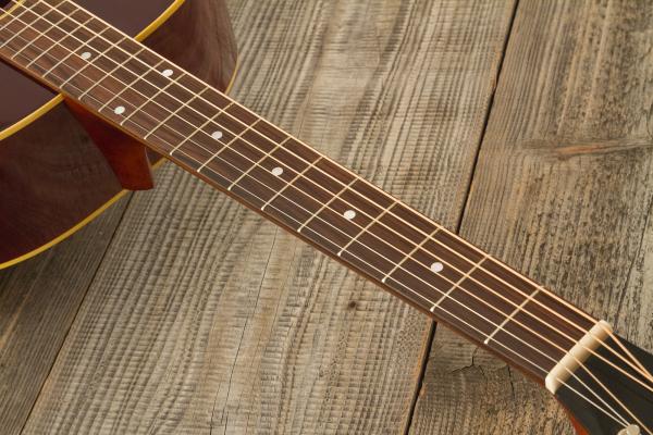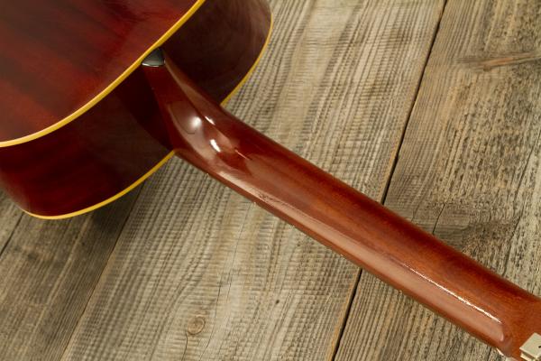 Son exemplaire lutherie massive est constituée d'essences splendides : table Erable Sitka torréfié, fond/éclisses Acajou, barrages "Pre-war scalloped", manche Acajou, touche et chevalet Palissandre Santos.