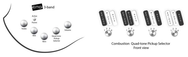 - Pré-amplification active/passive EMG avec volume, sélecteur de micros rotatif, bass/mid/treble, switch actif/passif
