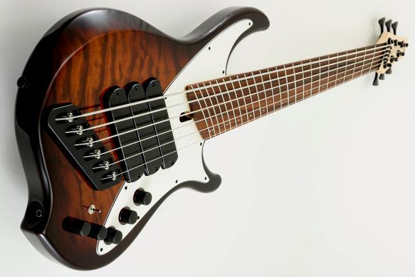 Basse électrique solid body six cordes, électronique active/passive, corps Frêne "Swamp Ash", manche Erable cinq pièces haute stabilité, touche Erable ou Pau Ferro* multi-diapason, 24 frettes en éventail.