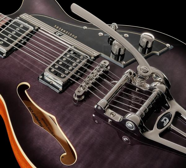A la croisée des chemins entre Gibson©, Gretsch© ou James Trussart©, la guitare électrique demi-caisse (avec bloc sustain interne) DUESENBERG Starplayer CBR (Transparent Black Burst) n'a rien a envier aux meilleures productions US.