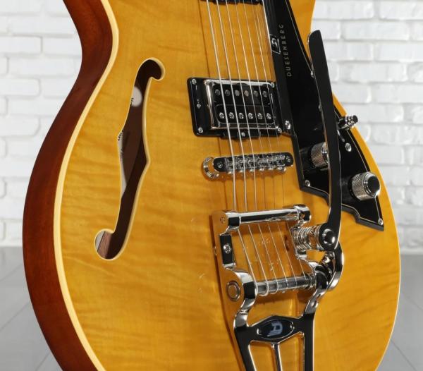 A la croisée des chemins entre Gibson©, Gretsch© ou James Trussart©, la guitare électrique demi-caisse (avec bloc sustain interne) DUESENBERG Starplayer CBR (Transparent Honey) n'a rien a envier aux meilleures productions US.