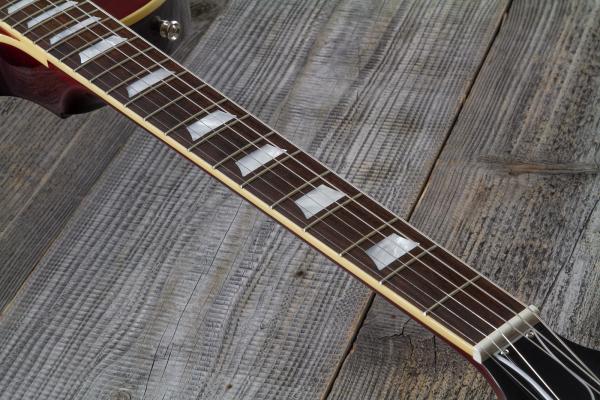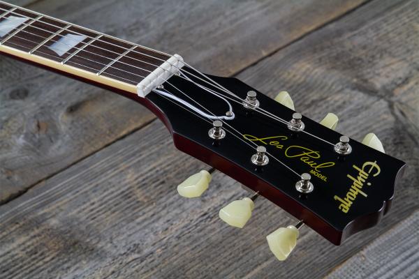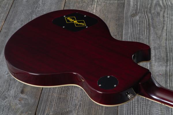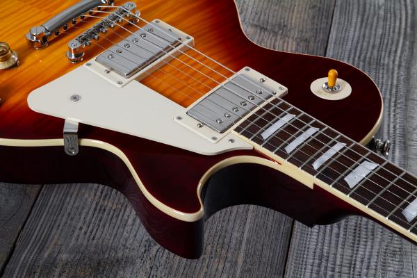 C'est un instrument de haute facture et de fabrication traditionnelle avec caisse en Acajou et table Erable flammé AAA, manche collé à l'ancienne "long neck tenon" (plus de stabilité et meilleur sustain) en Acajou (profil '59 Rounded Medium C), touche Palissandre, micros Gibson USA Custombucker AlNiCo 3 câblés façon vintage avec capacités Bumble Bee, potentiomètres CTS sélecteur et fiche jack Switchcraft.