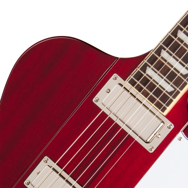 Construction traditionnelle avec corps en Acajou, manche traversant neuf pièces Acajou/Noyer (profil Slim Taper C), touche Palissandre, micros mini double-bobinage Epiphone ProBucker FB720, potentiomètres CTS.