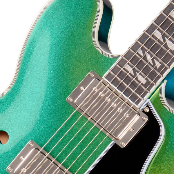Sa lutherie reprend l'essentiel du cahier des charges original avec une caisse 5-ply Erable/Peuplier pourvue d'un bloc central qui exacerbe la durée de note (sustain) et limite les problématiques de feedback inhérentes à ce type de lutherie "hollow body". Le manche est en Acajou et la touche en Ebène, un point positif si vous aimez les sonorités nettes, précises. Les 22 frettes sont en acier inoxydable, un autre argument très qualitatif.
