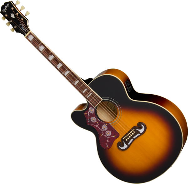 La guitare folk électro-acoustique EPIPHONE Inspired By Gibson SJ-200 Studio EC Left Handed (EASJ2CVSNH1L) est une réinterprétation grand public de la Gibson SJ-200 vintage des années 1950 (le fond et les éclisses des modèles produits avant 1947 était en Palissandre, remplacé par de l'Erable après cette date).