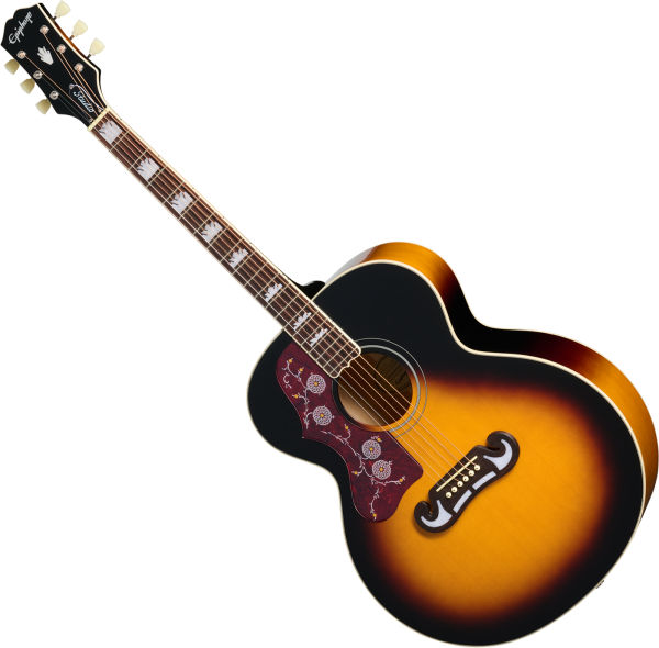 La guitare folk électro-acoustique EPIPHONE Inspired By Gibson SJ-200 Studio Left Handed (EASJ2VSNH1L) est une réinterprétation grand public de la Gibson SJ-200 vintage des années 1950 (le fond et les éclisses des modèles produits avant 1947 était en Palissandre, remplacé par de l'Erable après cette date).