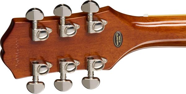 Fabrication traditionnelle avec caisse en Acajou et table Erable, manche collé "long neck tenon" en Acajou (profil SlimTaper 60s C), touche Palissandre, micros double-bobinage Epiphone Probucker, potentiomètres CTS.