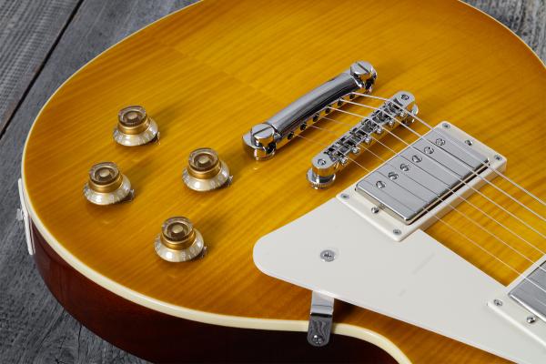 C'est un instrument de haute facture et de fabrication traditionnelle avec caisse en Acajou et table Erable flammé AAA, manche collé à l'ancienne "long neck tenon" (plus de stabilité et meilleur sustain) en Acajou (profil '59 Rounded Medium C), touche Palissandre, micros Gibson USA Custombucker AlNiCo 3 câblés façon vintage avec capacités Bumble Bee, potentiomètres CTS sélecteur et fiche jack Switchcraft.