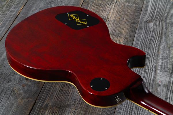 C'est un instrument de haute facture et de fabrication traditionnelle avec caisse en Acajou et table Erable flammé AAA, manche collé à l'ancienne "long neck tenon" (plus de stabilité et meilleur sustain) en Acajou (profil Slim Taper), touche Palissandre, micros Gibson USA Custombucker AlNiCo 3 câblés façon vintage avec capacités Bumble Bee, potentiomètres CTS sélecteur et fiche jack Switchcraft.