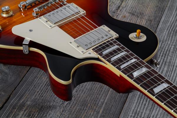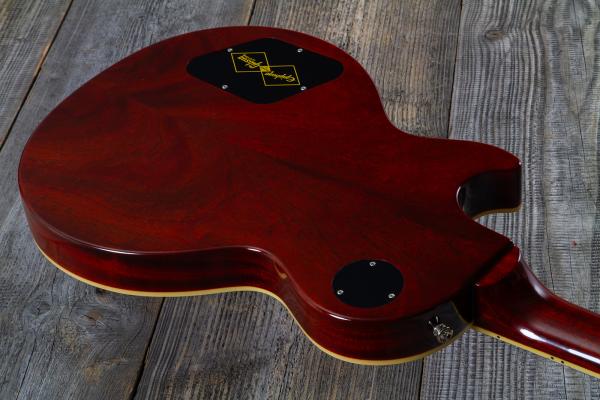 C'est un instrument de haute facture et de fabrication traditionnelle avec caisse en Acajou et table Erable flammé AAA, manche collé à l'ancienne "long neck tenon" (plus de stabilité et meilleur sustain) en Acajou (profil Slim Taper), touche Palissandre, micros Gibson USA Custombucker AlNiCo 3 câblés façon vintage avec capacités Bumble Bee, potentiomètres CTS sélecteur et fiche jack Switchcraft.