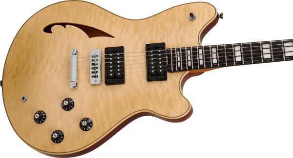 C'est une semi-hollow body compacte dotée d'une caisse en Acajou, d'une table en Erable figuré, d'un manche vissé deux pièces en Acajou et d'une touche en Ebène 22 frettes (diapason 24.75" façon Gibson©).