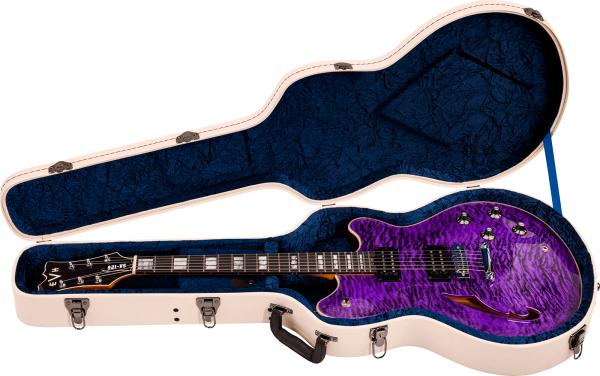 C'est une semi-hollow body compacte dotée d'une caisse en Acajou, d'une table en Erable figuré, d'un manche vissé deux pièces en Acajou et d'une touche en Ebène 22 frettes (diapason 24.75" façon Gibson©).