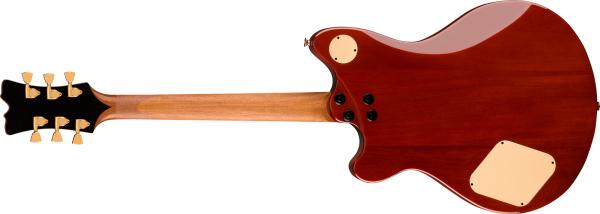 C'est une semi-hollow body compacte dotée d'une caisse en Acajou, d'une table en Erable figuré, d'un manche vissé deux pièces en Acajou et d'une touche en Ebène 22 frettes (diapason 24.75" façon Gibson©).