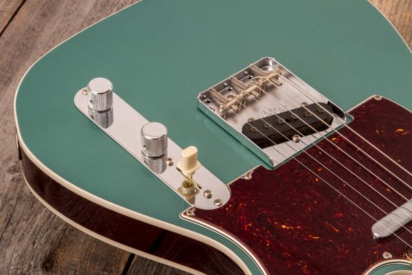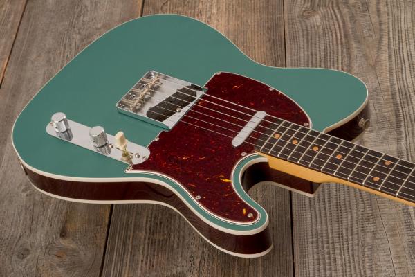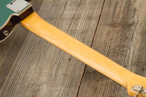 Elaborée à partir de la plateforme d'une "1960 Telecaster Base Model", la FENDER Custom Shop Time Machine 1959 Telecaster Custom Time Capsule Sherwood Green #R146446 (9237002904) est la réinterprétation hybride d'une Telecaster des années 50 et de la Custom du milieu des années 1960 immédiatement identifiable grâce à ses filets bordant élégamment les bordures de la caisse. Elle combine idéalement une majorité de caractéristiques strictement vintages et quelques autres plus actuelles.