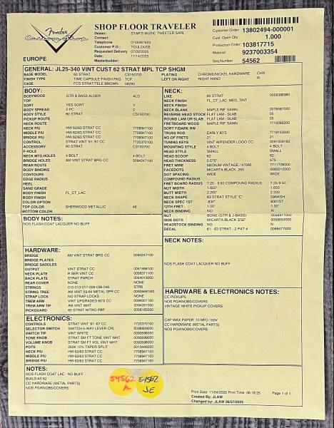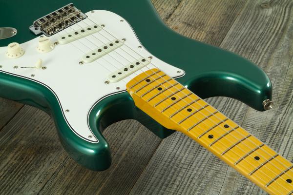 Guitare électrique solid body, corps en Aulne "sort for lighweight", manche vissé en Erable "rift-sawn", touche Erable (profil '63 Style C, frettes médium-vintage, radius hybride 7.25" / 9.5"), micros Custom Shop bobinés à la main 1962/63 Strat.