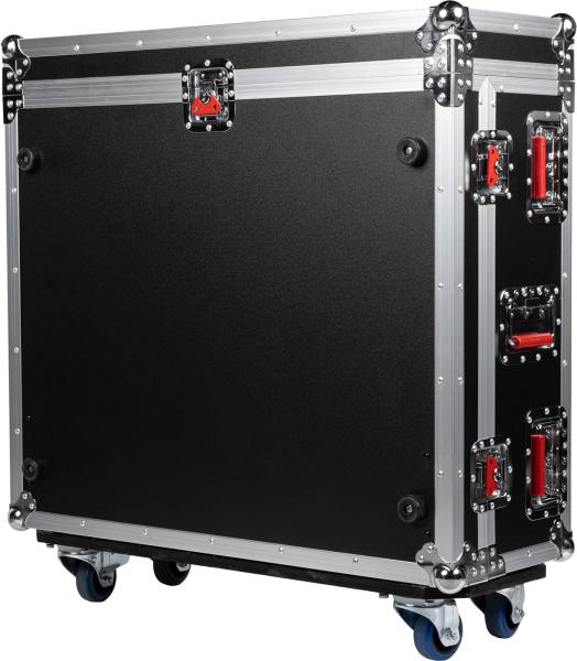 Les fermetures encastrées rouges emblématiques de Gator et les poignées à ressort gainées de caoutchouc assurent une fermeture sécurisée et une prise en main confortable. Le plateau à roulettes intégré, équipé de deux roues avec frein, permet un transport fluide, stable et sans effort, même sur de longues distances.