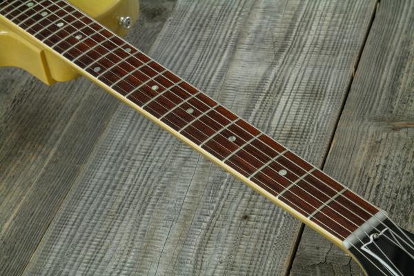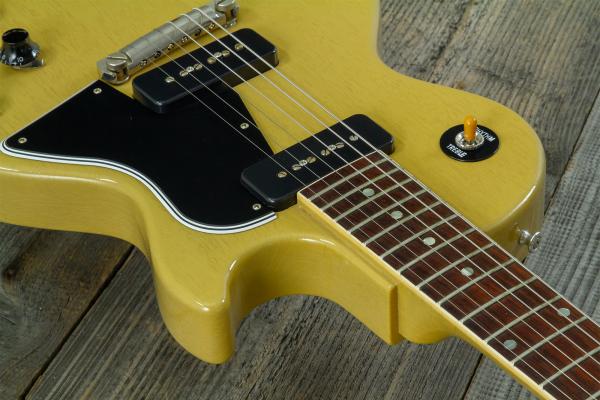 Construction millimétrée (jointure "Long Neck Tenon", colle "hot hide glue*"), dimensions scannées au laser, composants de grade supérieur (corps et manche en Acajou massif, touche Palissandre massif, micros P-90 Alnico V), plastiques recréés chimiquement.