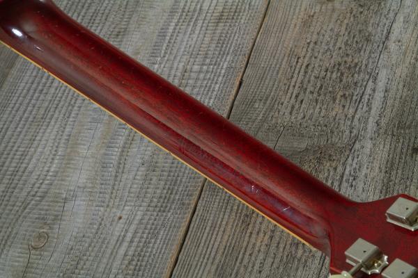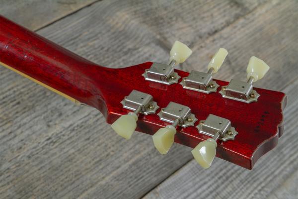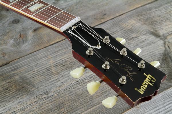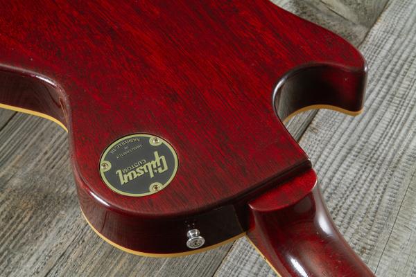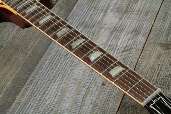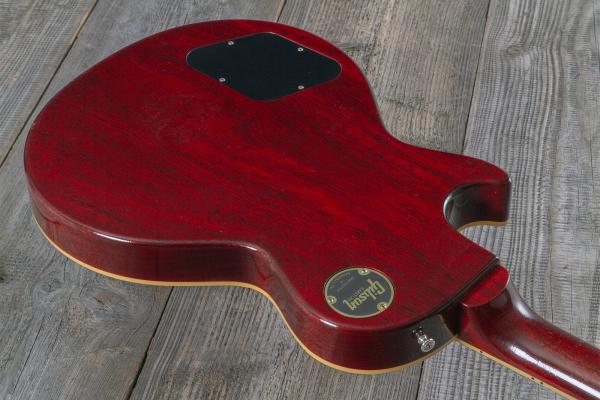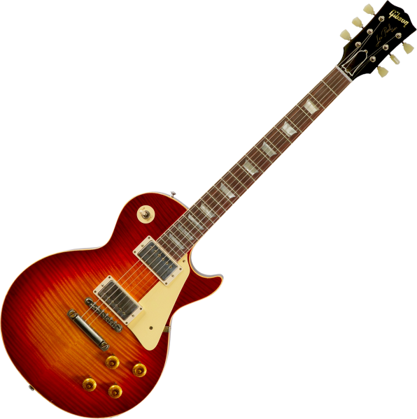 Cette guitare électrique solid body GIBSON Custom Shop M2M 1959 Les Paul Standard Reissue #934249 (LPR59M2M21268), exemplaire unique constitué d'éléments de grade premium, est en tout points similaire à la '59 originale, avec une caisse en Acajou massif léger, un manche en Acajou massif équipé d'une touche en Palissandre massif joint grâce à la méthode "Long Neck Tenon" et à de la colle "Hot Hide Glue" qui optimisent le transfert des vibrations.