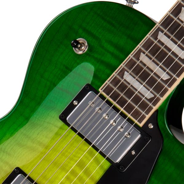 Ergonomique, légère et polyvalente, elle possède corps en Acajou massif de type "Ultra-Modern Weight Relief", table en Erable figuré AA, manche en Acajou avec talon profilé, touche en Ebène 22 frettes, set de micros Classic '57 (manche) / Classic '57+ (chevalet) agrémentés de potentiomètres de volume push/pull pour activer des options simple ou double bobinage, phase et pure bypass.