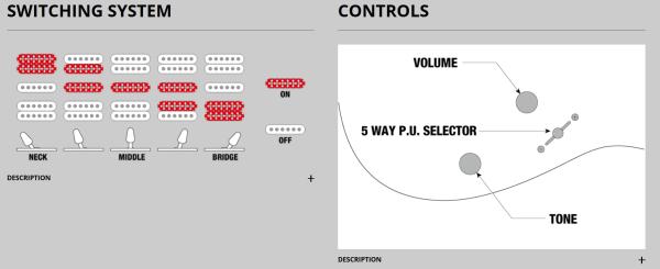 Inspirée de la plateforme Fender© Stratocaster©, elle en est une variante 'Hot Rod' avec un manche 24 cases offrant un accès aux aigus étendu et de multiples sonorités grâce à une configuration électronique flexible (elle propose en particulier des saturations plus généreuses qu'avec les micros simple bobinage d'une Strat).