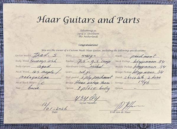 Cette HAAR GUITAR Trad S #43484 se distingue par un corps en Frêne "Swamp Ash" une pièce, un manche en Erable, une touche en Palissandre de Madagascar (radius hybride 7.5" / 9.5") et des micros Kloppmann '54.
