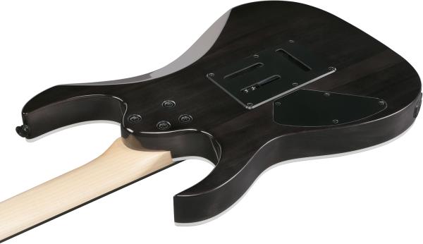 Corps Peuplier, table Erable figuré, manche vissé en Erable, touche Purpleheart, 24 frettes, micros double bobinage Ibanez Infinity R, vibrato traditionnel.