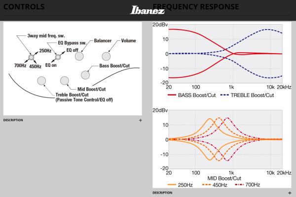 - Ibanez Custom Electronics 3-band EQ w/ EQ bypass switch (passive tone control on treble pot) & 3-way Mid frequency switch
