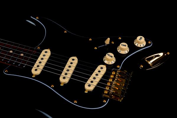 Corps en Peuplier torréfié, manche vissé en Erable torréfié, touche en Palissandre (22 frettes, profil Modern C, diapason 25.5", radius 9.5"), micros simple-bobinage avec aimants Alnico 5, vibrato traditionnel, mécaniques à blocage.