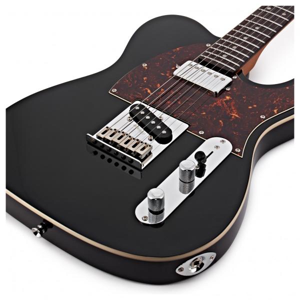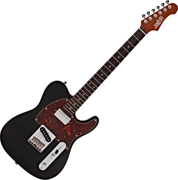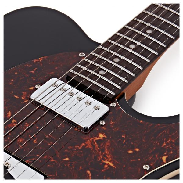 Corps en Peuplier torréfié, manche vissé en Erable torréfié, touche en Palissandre (22 frettes, profil Modern C, diapason 25.5", radius 9.5"), configuration de micros simple + double-bobinage avec aimants AlNiCo, chevalet Wilkinson, mécaniques à blocage.