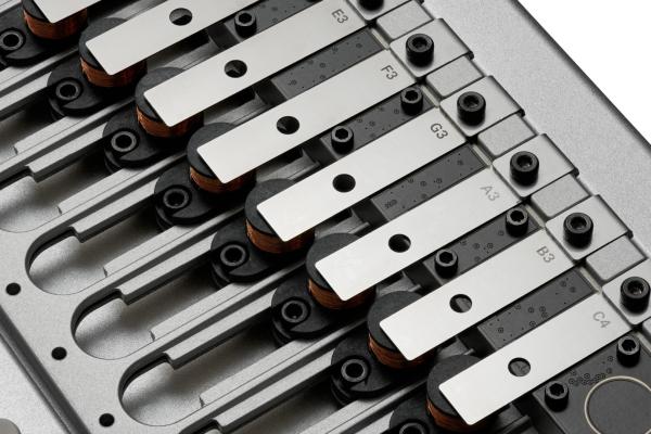 Le résultat : un instrument organique, haptique et ultra-réactif, qui semble vivant sous vos doigts et qui interagit naturellement avec son environnement (toucher, frottements, feedback acoustique). Sculptez le timbre en pinçant, tapotant, frottant les résonateurs, ou expérimentez en y ajoutant des objets. Le curseur AIR permet d’amplifier ou d’atténuer la réponse acoustique de tout ce qui entre en contact avec l’instrument.