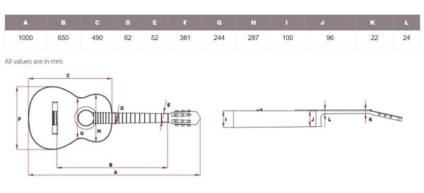 - Largeur manche 1e frette : 52 mm (sillets en os)