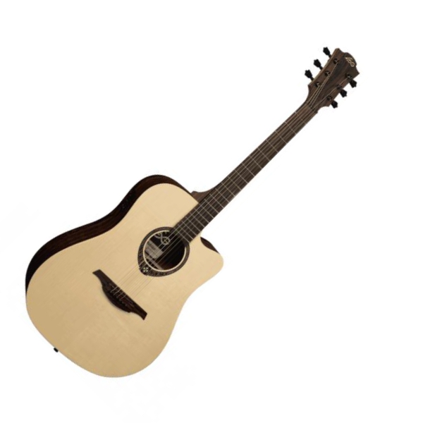 La guitare folk électro acoustique LAG Tramontane T270DCE est une Dreadnought pan coupé dotée de sonorités claires, dynamiques et profondes dispensées par sa lutherie assez originale, constituée d'une table en Epicéa Sitka massif et d'une caisse en Snakewood*.