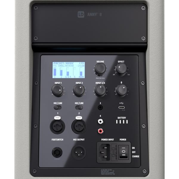 Doté d'une table de mixage 5 canaux intégrée, d'un égaliseur 3 bandes, de 5 préréglages d'application (MUSIQUE, LIVE, VOCAL, ÉCO, FLAT) et d'effets tels que la réverbération et le delay, il allie fonctionnalités complètes et qualité sonore exceptionnelle dans un design compact et intemporel. ANNY® 8 impressionne par sa connectique polyvalente : deux entrées combo micro/ligne, un canal stéréo avec jack 3,5 mm (AUX) et entrées RCA, ainsi que le Bluetooth 5.0 avec codec AAC.