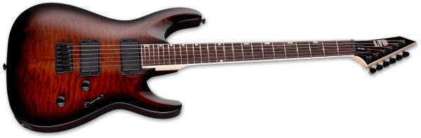 La guitare électrique solid body LTD BY ESP MH-200HT QM (Dark Brown Sunburst) est une version grand public de l'ESP Horizon, elle même réinterprétation d'un modèle américain référentiel, optimisée pour le Hard-Rock et le Metal.