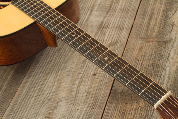 Tous les bois sont bien évidemment massifs. Elle est constituée d'une table d'harmonie en Epicéa Sitka premium, d'un combo fond/éclisses en Acajou flammé, d'un manche en Acajou et d'une touche Ebène.