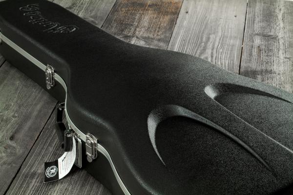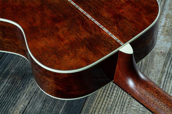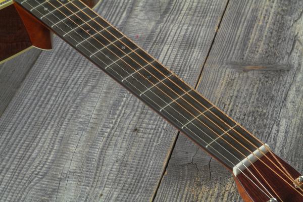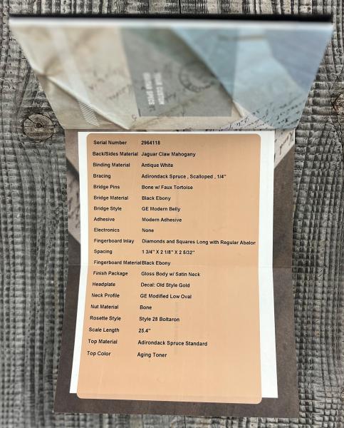 Elle est constituée d'une table d'harmonie et de barrages en Epicéa Adirondack, d'un combo fond/éclisses en Acajou "Jaguar Claw" et d'une touche Ebène.