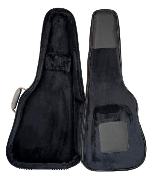 Son rembourrage intérieur de 20 mm assure une excellente absorption des chocs, tandis que l’attache de sécurité pour le manche maintient la guitare parfaitement en place pendant le transport. Pour un confort optimal, la housse dispose d’une poignée rembourrée ainsi que de deux courroies larges, ajustables et confortables, idéales pour un port sur le dos.