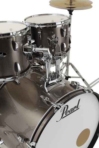Depuis des années, Pearl fait partie des fabricants qui règnent sur l’entrée de gamme, avec des produits toujours très bien étudiés, de façon à proposer le maximum à un tarif minimum. En attestent ces fûts qui totalisent 6 plis de peuplier pour une épaisseur de 7 mm, avec un Rhodoïd impeccable proposé en trois couleurs. Dans le cas présent, le « bronze metallic » allie la rareté et l’élégance. Quant à l’accastillage, Pearl affiche comme toujours ses lettres de noblesse, avec une réputation de solidité qui vaut aussi pour ses entrées de gamme. Piques, tiges, coquilles et cercles ne font jamais défaut, tout comme le déclencheur de timbre. Tout a été étudié pour durer, y compris sous les baguettes de débutants qui n’ont pas forcément les bons gestes.