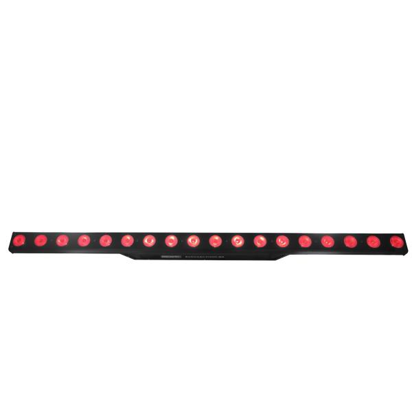Doté de 18 LEDs RGBW de 8 W, cette barre allie puissance et polyvalence. Son contrôle par segments multiples (jusqu’à 18) permet d’obtenir des effets visuels riches et variés, parfaits pour dynamiser un décor, un mur ou un fond de scène.