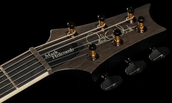 La Mark Holcomb offre un cahier des charges remarquable et des performances à l'avenant. Dérivée de la référentielle Custom 24 dont elle reprend nombre d'éléments (corps Acajou, manche collé 24 frettes), elle a été remaniée sur les recommandations de l'artiste avec un diapason sensiblement plus long (25.5"), un manche en Erable avec touche Ebène pour une définition optimale, un radius 20" qui facilite grandement les phrasés techniques, un chevalet fixe et enfin un duo de micros Seymour Duncan Mark Holcomb Scourge (chevalet) et Scarlet (manche) associé à un potentiomètre push/pull permettant de basculer de simple à double bobinage.