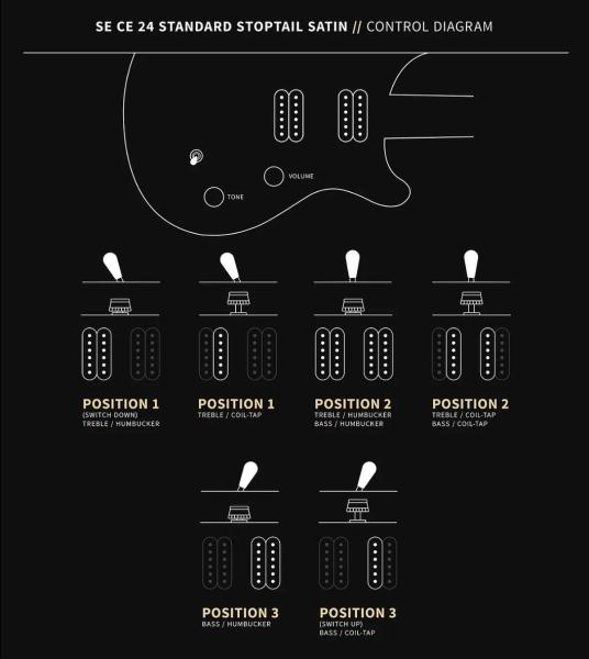 La PRS SE CE 24 Standard Stoptail Satin fait preuve de part sa lutherie hybride de beaucoup de flexibilité, d'autant que le potentiomètre de tonalité est augmenté d'une fonction push/pull qui double les combinaisons de micros.