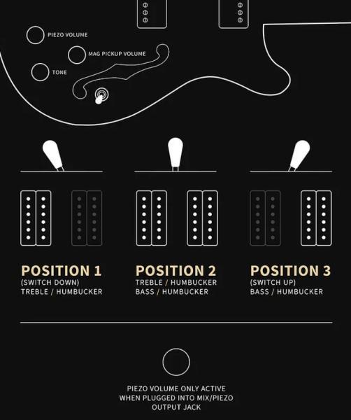 Elle est donc munie d'une caisse creuse (en Acajou et Erable) qui exacerbe sa résonance et son amplitude naturelles et lui confère une dimension acoustique. C'est la plateforme idéale pour le système LR Baggs/PRS Piezo embarqué. Grâce à un volume et une sortie dédiés vous pourrez selon vos besoins utiliser une sortie combinant les circuits magnétiques et piezo (le potentiomètre de volume permet alors d'équilibrer les deux signaux), ou bien d'utiliser des sorties séparées et envoyer le piezo vers un système de diffusion adéquat pour une optimisation de la sonorité acoustique (le potentiomètre de volume commande alors uniquement le niveau du piezo).