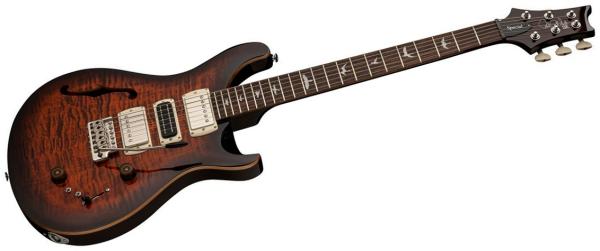 La PRS SE Special Semi-Hollow (Wing Tuners, Orange Tiger Smokeburst) est une évolution de la Custom 24 originale, extrêmement intéressante de part sa flexibilité sonore. Elle est munie d'une caisse de type "chambered" (en Acajou et Erable avec un bloc central) qui exacerbe sa résonance et son amplitude naturelles.