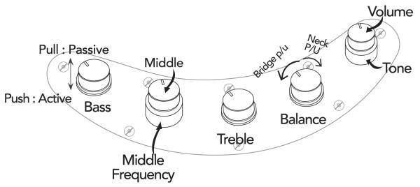 - Contrôles : Volume/Tone (potentiomètre concentrique), Blender, Treble, Middle/Middle Frequency (potentiomètre concentrique), Bass, Mini Toggle (Active / Passive )