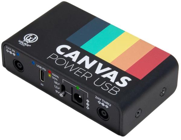 WALRUS AUDIO Canvas Series Power USB est une alimentation isolée avec une sortie variable de 9/12/18 V jusqu'à 500 mA, qui permet d'alimenter votre pedalboard à partir de la plupart des systèmes USB Power Delivery (PD) comme chargeurs d'ordinateurs portables ou de smartphone haute puissance.