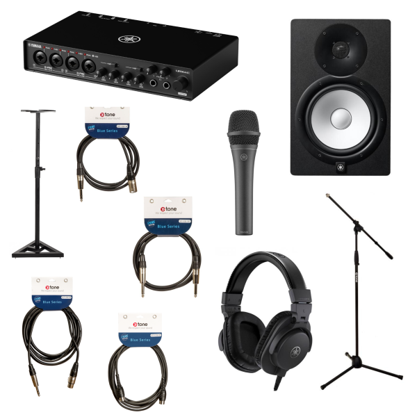 Pack comprenant deux enceintes HS8 + une carte son URX44C + deux câbles Jack / XLR 3m. + un câble micro Jack / XLR 3m + deux câbles Jack / XLR 3m + quatre câbles Jack / Jack 1.5m + deux stand pour enceinte + un micro YDM 505 et son pied XH6000 + un casque studio ouvert HPH-MT5.